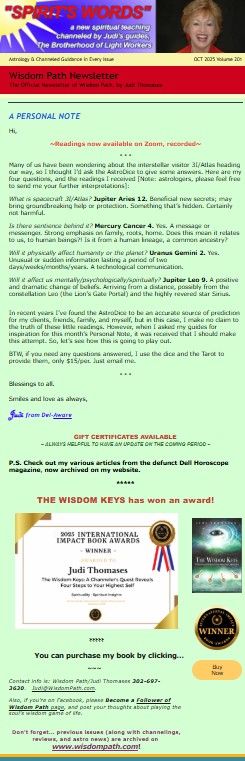 Email Collecting ListJoin Judi's Mailing List * Please tell us how you felt about the Wisdom Path Guidance website. We'd like to know a little about you too.
